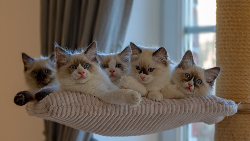 Unsere 4 kleinen Cocktails tapsen bereits lustig in die Welt hinaus. Tequila - bluepoint bicolor, weiblich - Marito - bluepoint bicolor, männlich - Bailys - sealpoint bicolor, weiblich - Bijou - sealpoint mitted, weiblich.